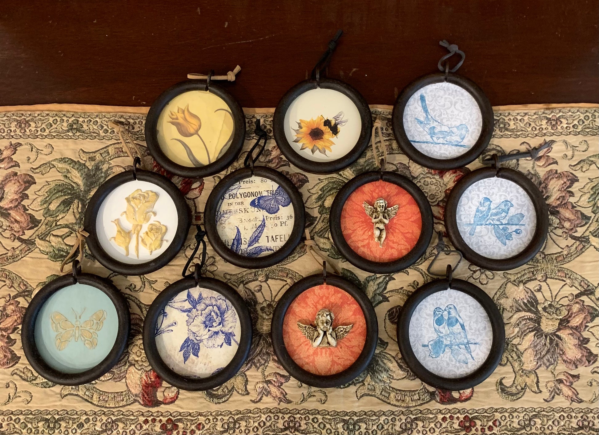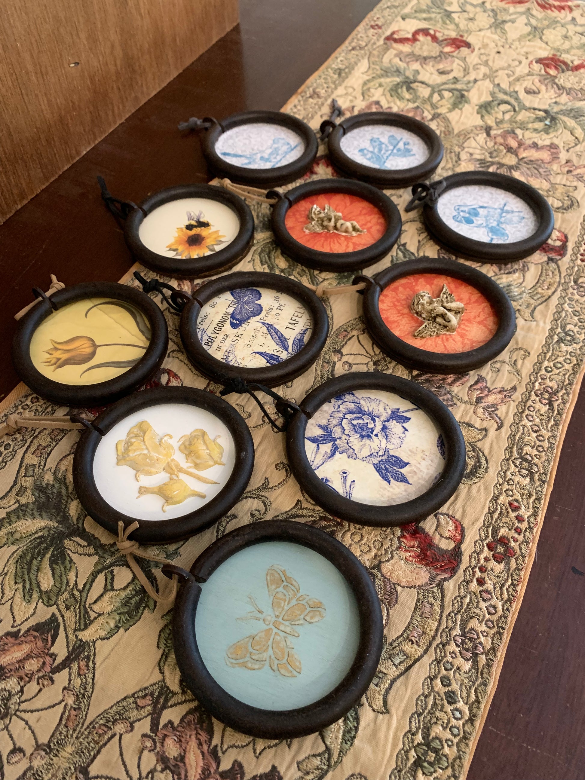 Cast iron curtain rings become unique decor for your home! 3 1/2” across with leather hanger and wood backing. Specify when ordering.