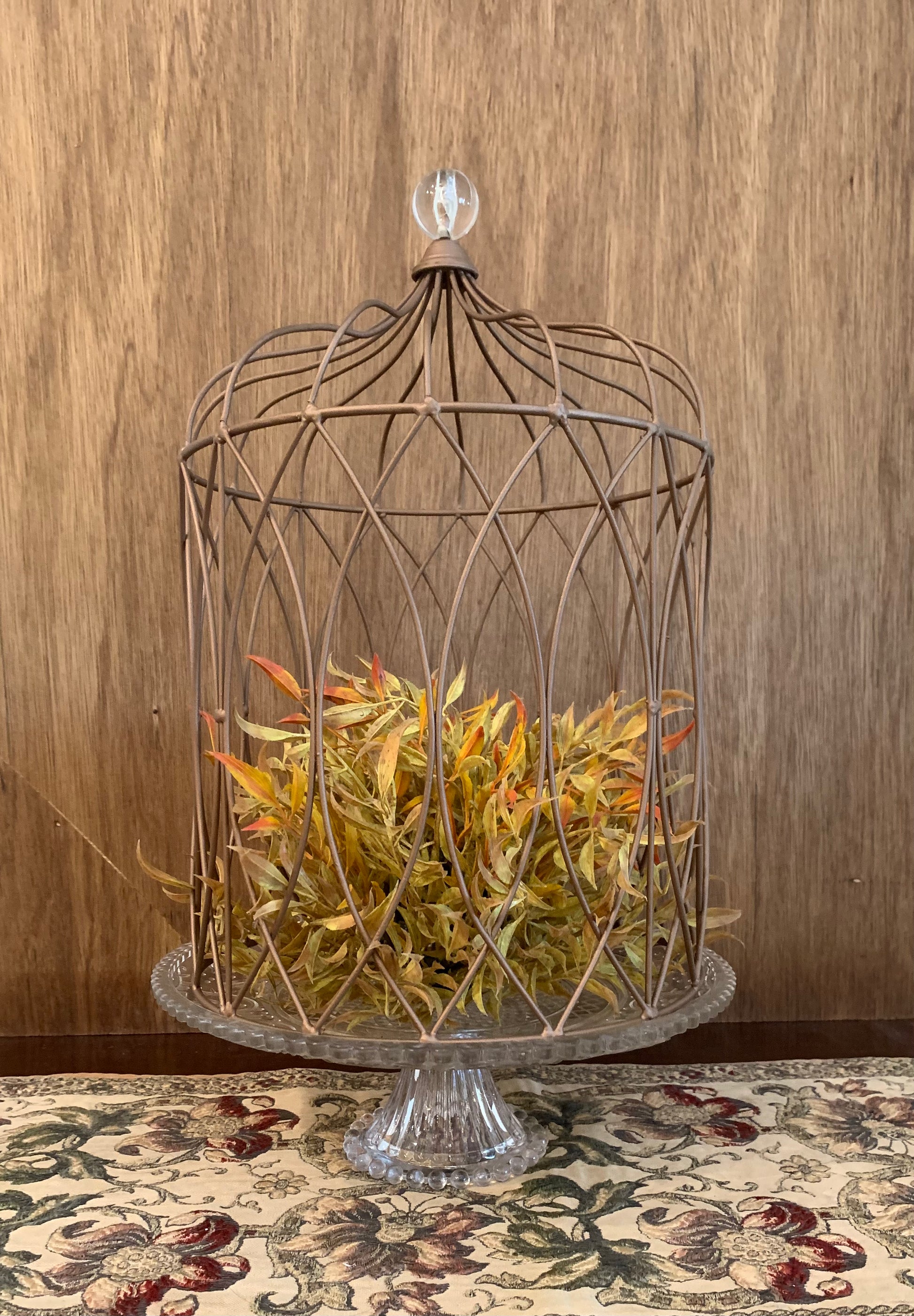 Medium sized decorative cake plate with lots of detail. Tall metal cloche with clear knob. 17” tall in total.
